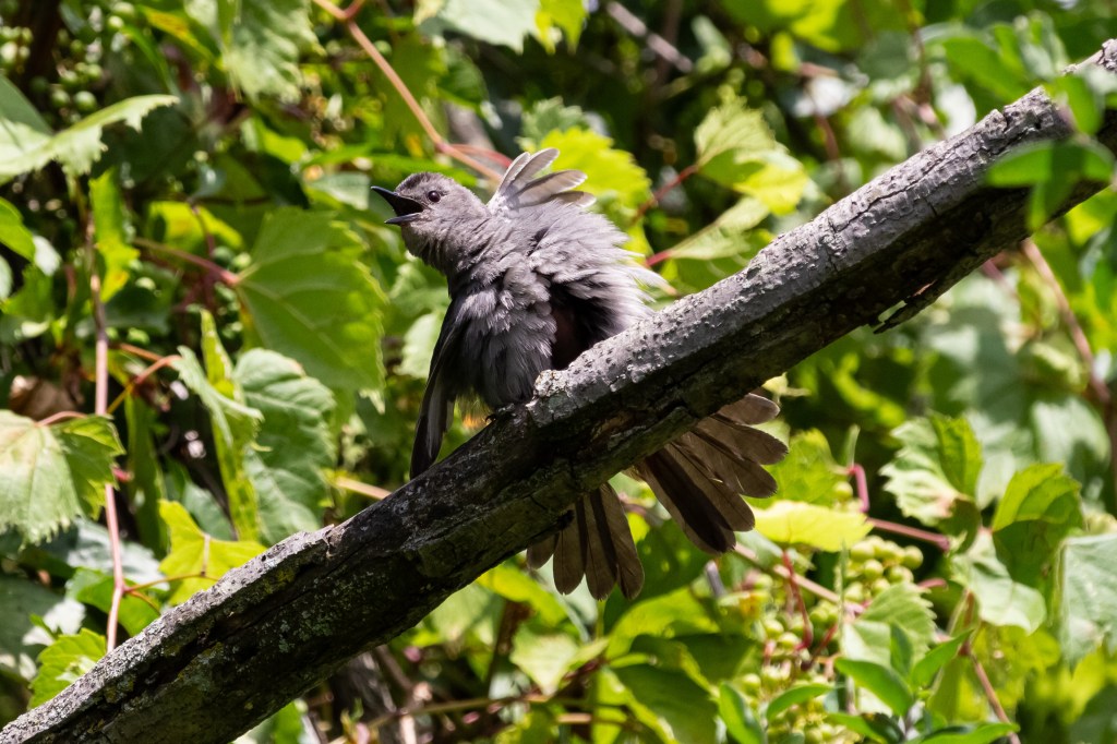 When the catbirds returned in the summer of ’24, they quite literally came out to greet me on several occasions. One of them even posed for me while sunning (using natural heat to kill off possible parasites), looking so happy and bold: