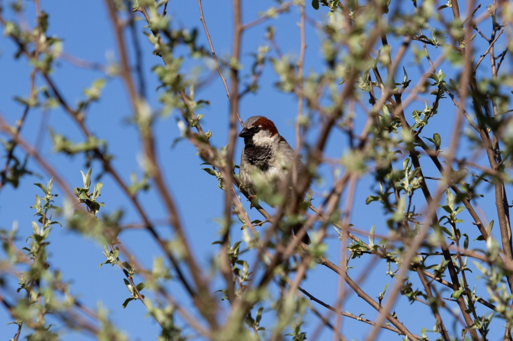 The males have been slower to relax around me, but when they do, the results have been fantastic! I have reason to believe that one male house sparrow was jealous of the attention I’ve given Sam, my song sparrow buddy. One afternoon, he perched next to me on this twig, posing with what looked like a self-satisfied smile: