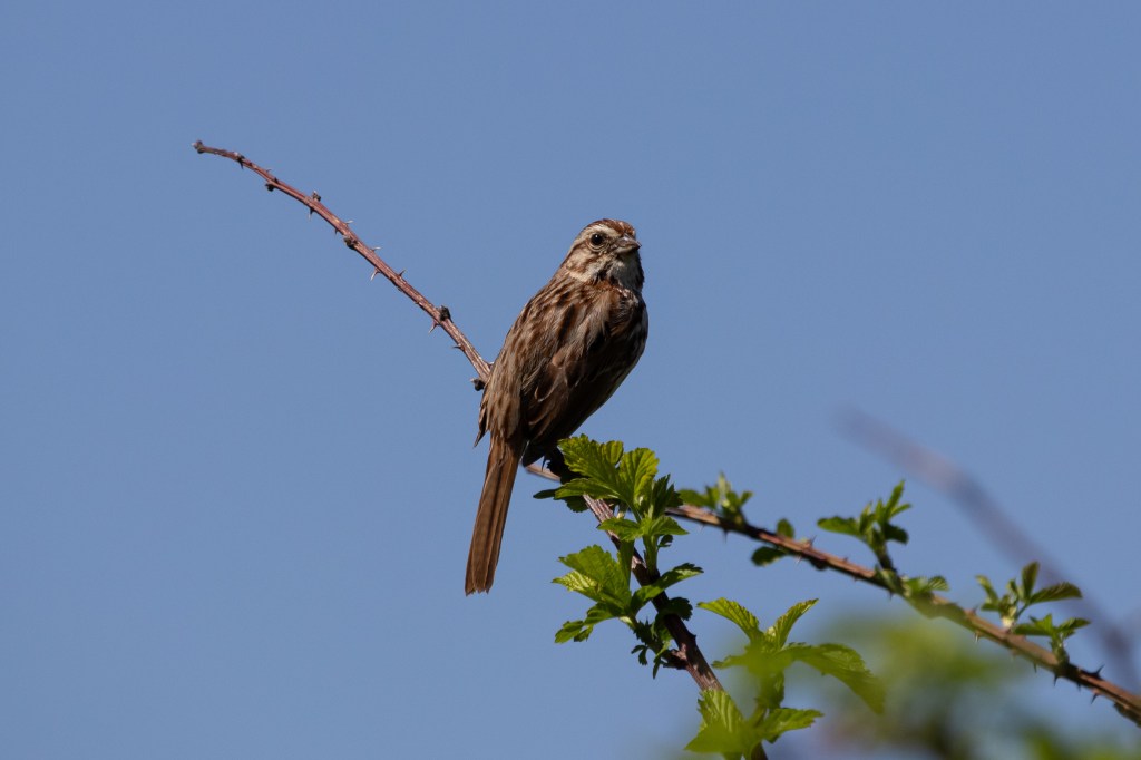 As a song sparrow, Sam (named in honor of Samwise Gamgee from The Lord of the Rings) is spunky, bold, and impressively patient. He loves to perch on a conspicuous spot close to me, throw his little head back, and belt out the sweetest song.