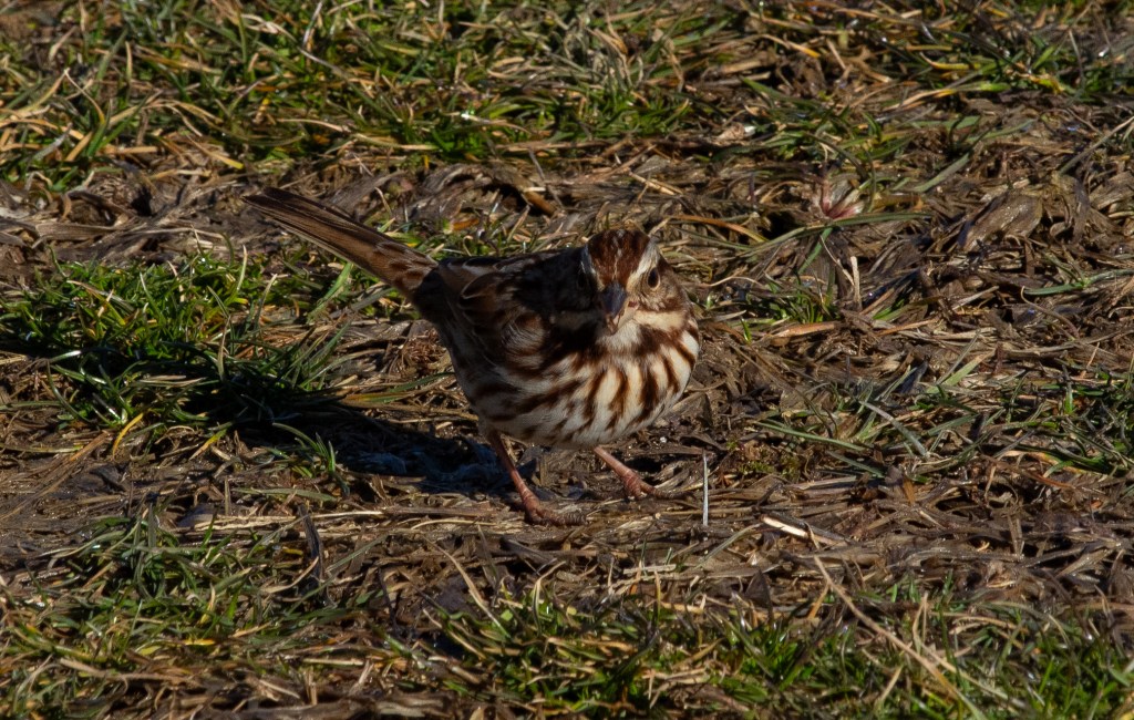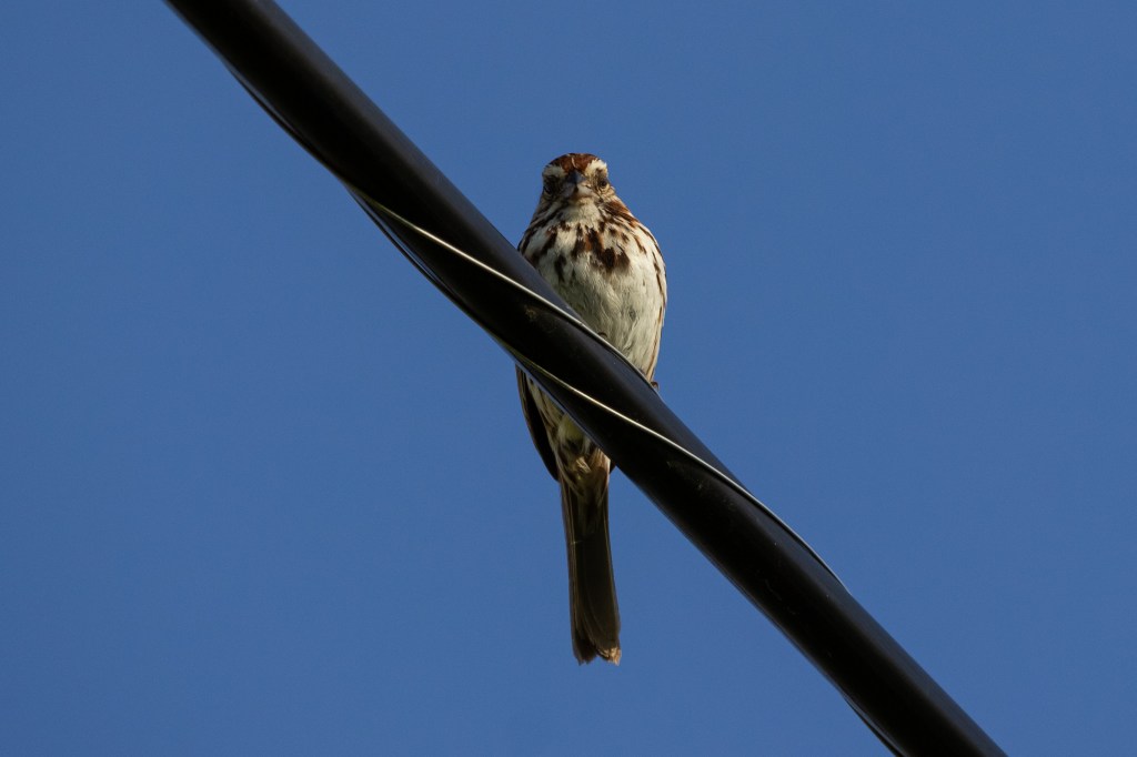 When the birds here see me walking, they’ll often perch low on one of the telephone wires and linger for a brief minute. This window of opportunity has helped me take some lucky shots, especially of Sam, my song sparrow buddy.